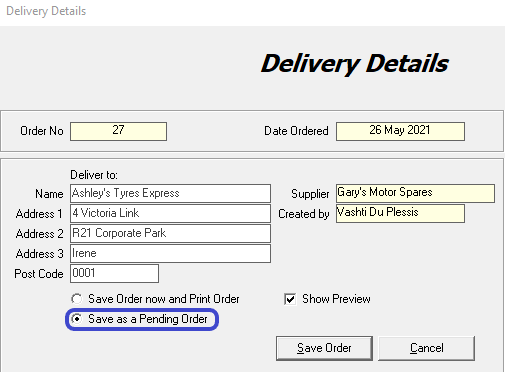 - Fetch Pending Orders : To fetch an order that was saved as a "Pending order" when the Purchase order was created: