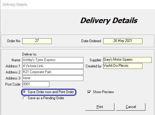 - Fetch Outstanding Orders: To fetch an order that was saved as "Save Order now and Print Order", and a Stock Receipt (GRV) for the order has not been done, or only a partial Stock Receipt (GRV) has been done: