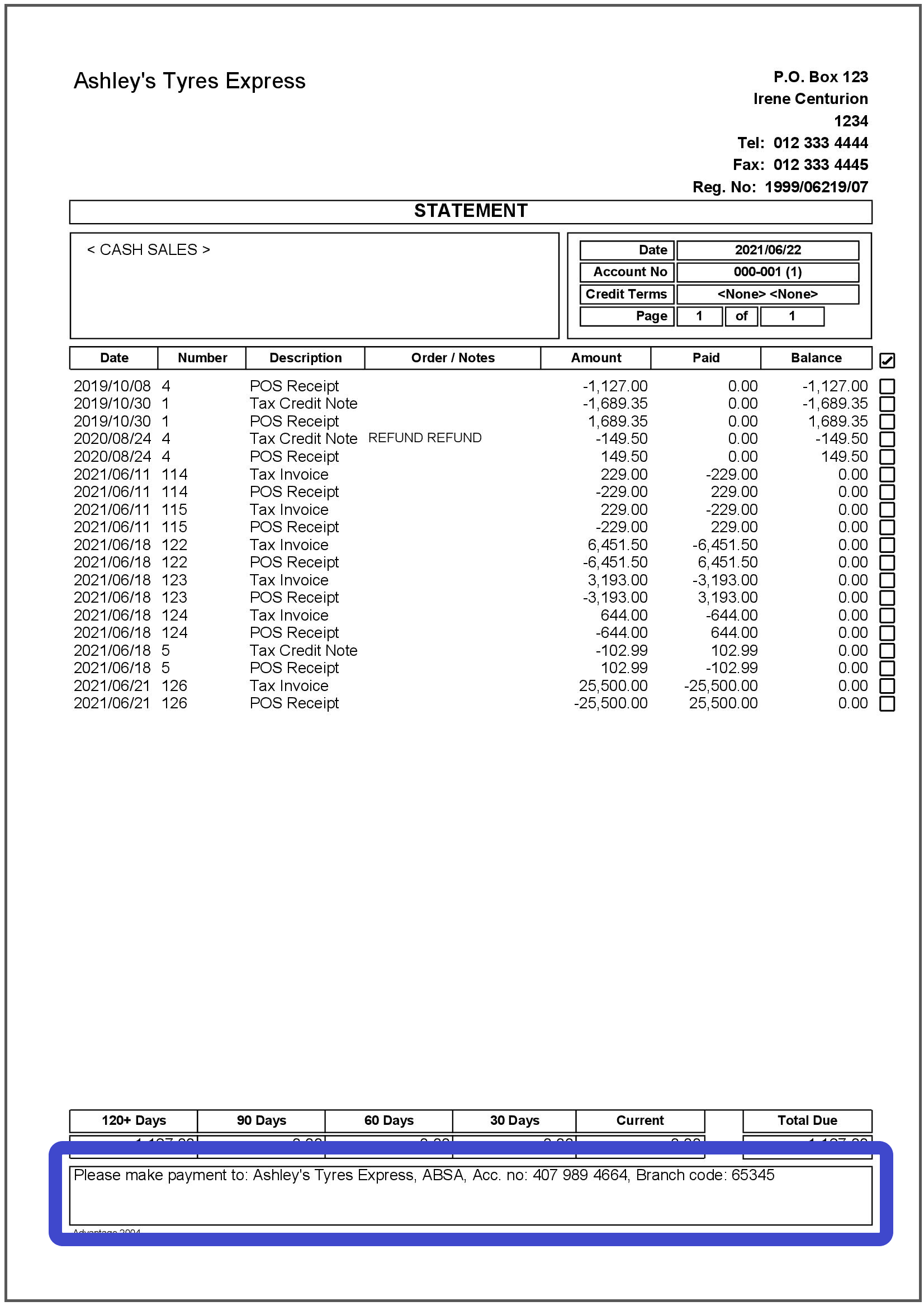 NOTE: If you would like to know how to add your banking details to the Statement Messages, click on the following link: How can I add or change customer statement message/s that is e-mailed with/ on their statements?