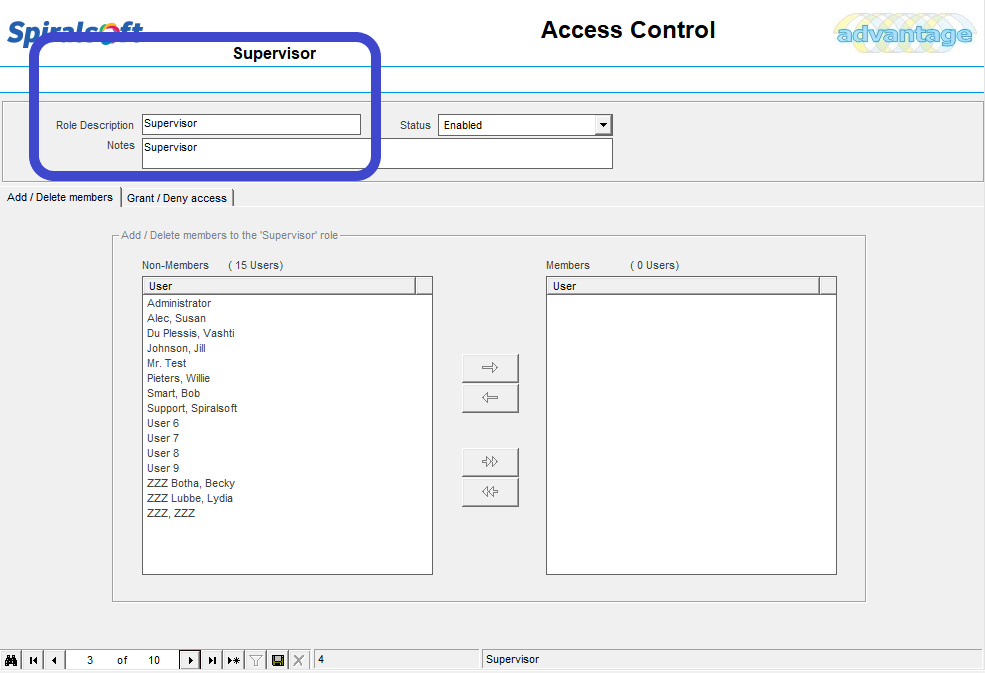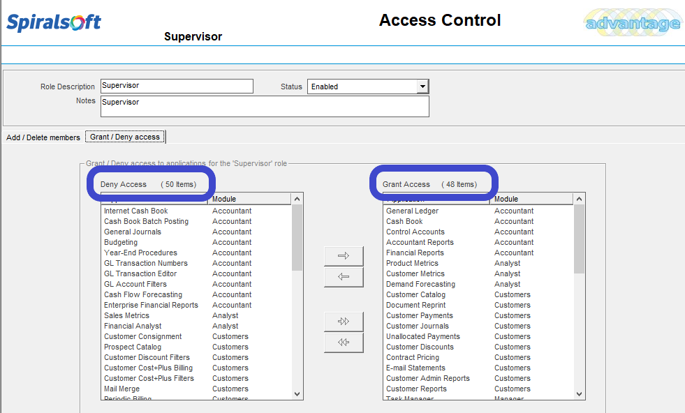 8. Denied modules / screens for the specific role will be displayed in the left-hand column, and allowed modules / screens for the specific role will be displayed in the right-hand column: