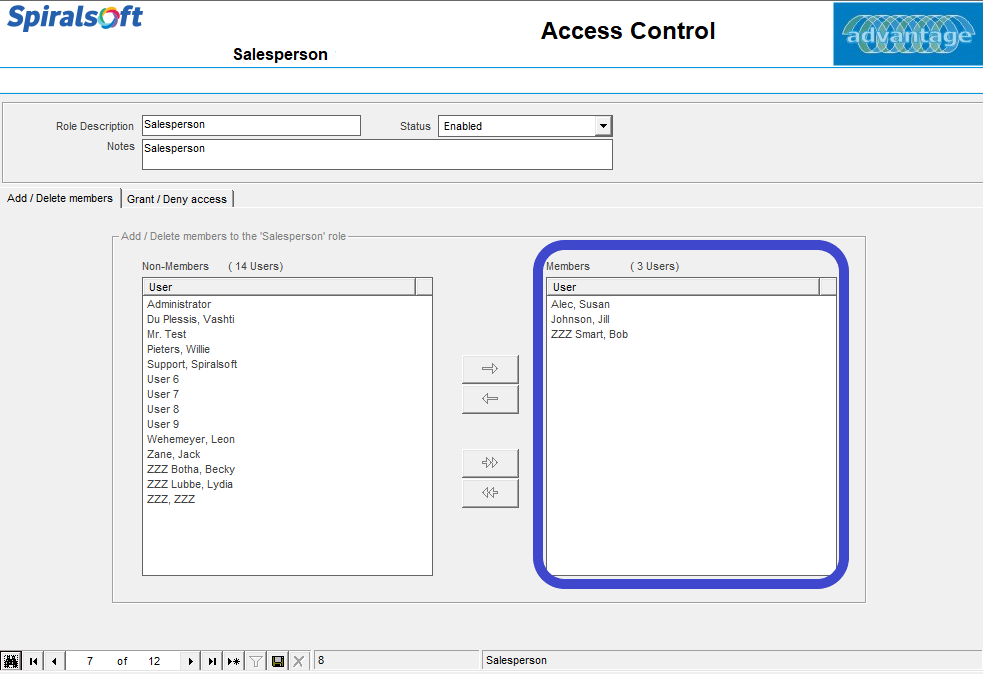 The Non-Members are not a part of the specific role, and do not have access to the modules that members of the specific role, has access to in Back-office. Non-Members of the specific role you are viewing, will be displayed in the Non-Members box on the Left-hand side. In the below example, you'll see that the Non-Members, who do not form a part of the Salesperson role, are: Administrator, Du Plessis, Vashti, Mr. Test, Pieters Willie, Support, Spiralsoft, User 6, User 7, User 8, User 9, Wehemeyer Leon, Zane Jack, ZZZ Botha Becky, ZZZ Lubbe Lydia, ZZZ ZZZ: