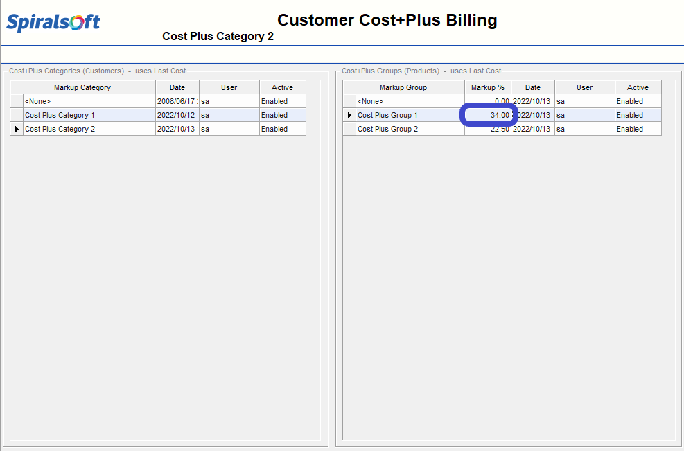 If you have access to the Customer Cost+Plus Billing screen, you will be able to link the Cost+Plus groups (products) to the Cost+Plus Category (customers), and set a markup %.