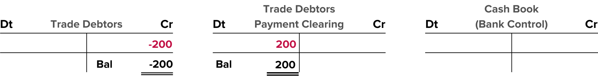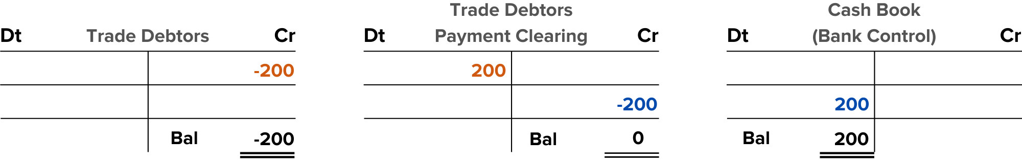 - Payments posted from the Customer Payments screen will NOT affect the Cash Control Account. Instead, they will be posted to the Trade Debtors Payment Clearing Account.