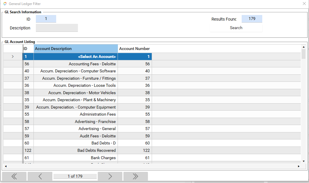 5. Type the search criteria in the Description field at the top of the General Ledger Filter window.